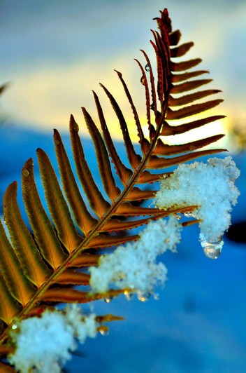 - In this image it is its mood which captures the jude's attention. Melting snow on top of a fern - backlight by the sun. Great photo!