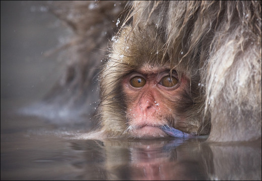 - A lovely, so sweet, and well composed portrait of a young Japanese macaque, or snow monkey. The photographer has caught a great, so human, expression and the lovely, misty, watery atmosphere of the hot spring during a snowfall. An endearing photograph, well done!