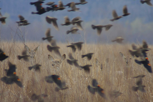 - Well this one came very close. It has so much wild, natural appeal that makes one feel the bush all around, a wonderful atmosphere. The disturbed flock of red wing blackbirds (?) alerting the deer to possible danger make this a true and exciting documentary photograph. It is the lack of sharpness on the deer that prevented this one getting further, a problem which could probably have been resolved with a post production sharpening tool.