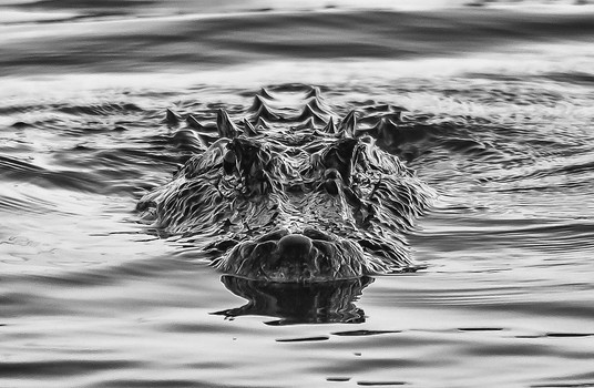- Terrifying! Great use of black and white to accentuate the shapes and textures of this beast. Clever noise reduction further camouflages this croc, giving an impression that it is part of the water coming to life. Great photo with creative post processing. Well done!