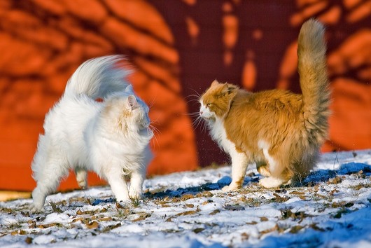 - Hello, my name is Werner Schmaeing, come from Dillenburg, Germany (100 km near Frankfurt). i made this photo from my two male Maine Coon cats near my house in November 2009. The white named "Amadeus" and the red/white named "Romeo". It is an hommage two this fantastic boys ... "Romeo" is died in May 2010 and "Amadeus" in Februar 2012 ... I made this shot with my Canon 1D Mark II and the 70-200 4.0 L IS, post processing with Photoshop Elements 7.