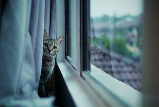 - love it. the cool tones, the receding line leading to both the subject and its reflection, the contrast of the soft curtain with the strong lines of the window, all make for an instant appeal to this image. but it's the expression captured -- both on the cat and repeated in its reflection -- that make this a truly memorable image. nicely done! ~ illona