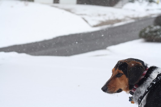 - beautiful shot. the framing, the falling snow, and the pensiveness of the dog's sideways gaze make for a wonderful image. nicely done. ~ illona