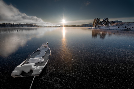 - Just stunning. A vey bold, high contrast shot, looking straight into the sun. It is well taken with great depth of field and perfect exposure, the complicated whites of the snow have been respected and are beautifully soft. I love the wide angle, the movement in the clouds and the way the frozen boat points into the picture. The black, icy water is unusual and reminiscent of a starry sky giving this image a magical feel. Well done, 1st place is well deserved, congratulations!