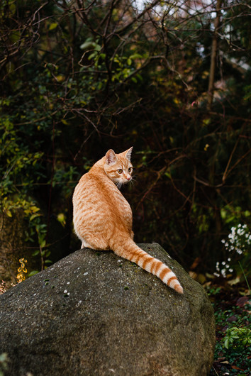 - i just love seeing cats out in nature (even though i do feel they're safer indoors) ... this image is wonderful in its contrast of colors and textures -- the soft fur, the sharply-in-focus whiskers, the gleam in his eyes, the rock and lichen, and the soft landscape beyond all make for a truly engaging image that invites you to visit more than once. nicely done. ~ illona