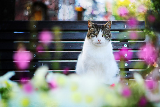 - this is a truly wonderful image ... the splashes of color framing this incredible character on his bench, and the sparkle of bokeh in the distance make this such an instantly captivating and beautiful image. of course, the expression on this feline makes this an instant fave and an image to be remembered. beautifully done! ~ illona