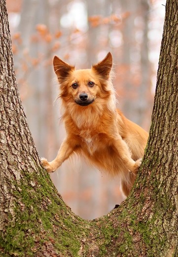 - this is a fun and unique image. wonderfully framed and an almost comical subject in his/her head-on stare into the camera. the textures are rich -- the bark, the moss, the dog's hair, and the beautiful flashes of orange leaves behind -- making this image the kind that invites the viewer to come back for multiple viewing to see more each time. an instant fave, and definitely a memorable image. nicely done! ~ illona