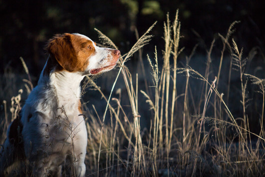 - the intensity in this Brittany's hunting gaze is beautifully lit by the late (or early) sun and wonderfully captured. the tall grasses add a beautiful texture, and the weeds in the foreground work to really place this dog in their environment. nicely done. ~ illona