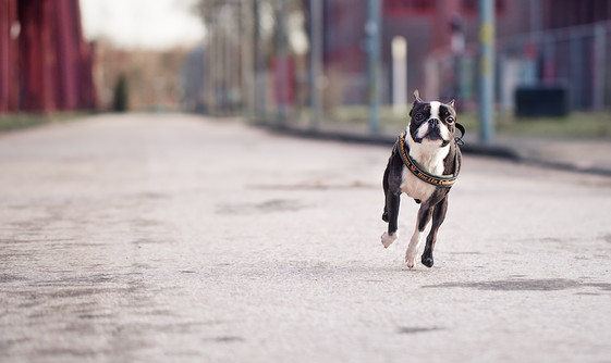 - this image is just so fun ... but then Boston Terriers are almost always fun no matter how you photograph them. flying down this empty street, almost as if he/she has broken loose from his leash, this Boston in full flight tells a story. a lovely lovely image. nicely done. ~ illona