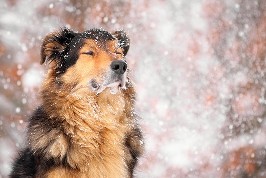 - with the falling snow and the strong colors, this is an absolutely beautiful piece. the dog's expression is wonderful. a truly perfect capture. thanks for sharing! ~ illona
