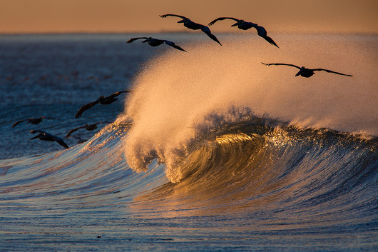 - The arc of silhouetted pelicans around the perfect golden wave really transports you to a special place and time.
