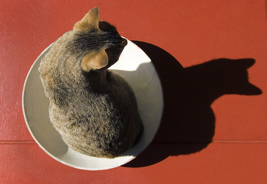 - a beautiful, simplistic image. the strong lines and shadow are as much a focus as the cat sitting in his bowl. i think a little more space added to the right of the frame would add a little breathing room and strength to this image, but otherwise a very wonderful and memorable image. ~ illona