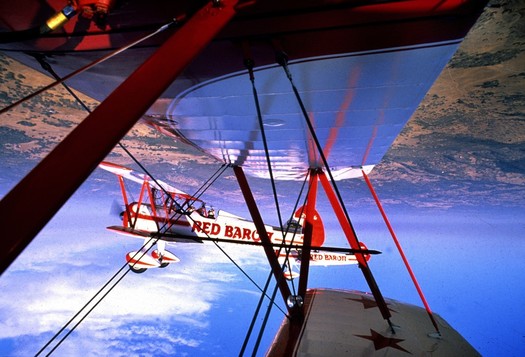 - I went out to photograph this Red Baron Pizza demonstration team east of Sacramento one morning. As we went into the sky for a news photo for my newspaper The Sacramento Union, the valley was fogged over. I took the color pictures, processed the Ektachrome only to find that there was no up, down, upside down, etc. So called them for a re-fly re-shoot at 2pm. This is the picture as we looped the loop in a giant circle, I thought it better to use the biplane look with the earth upside down (in the "sky"). Nikon 2000 with Vivitar 19mm lens. Jim Vestal