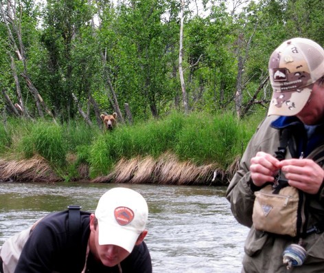 - American Creek Katmai National Park Alaska This photo was taken on American Creek in Katmai National Park (Alaska). I took my two sons on this fishing trip just prior to my youngest son's deployment to Afghanistan (U.S. Marine Corps). They were both busy rigging up their fishing rod and were oblivious to what was going on behind them. Luckily I had the camera ready (Nikon D90) and snapped the photo just before the brown bear ducked back into the bushes.