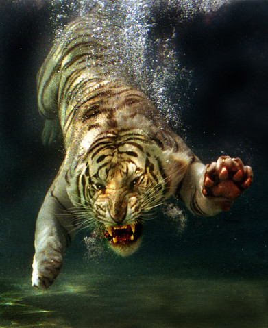 - What an amazing shot of a diving tiger. It is interesting to see how these giant cats (unlike their domestic cousins) fearlessly swim under water. He has a great facial expression with his nose squeezed shut, and a hungry hunter’s attitude. I like the mottled, warm and murky light which creates a swampy Sunderbans atmosphere. Very clever. It is though an extremely grainy photo which I think takes away from its technical quality. Perhaps this comes from shooting through the aquarium glass, or are you really in that swamp? ☺