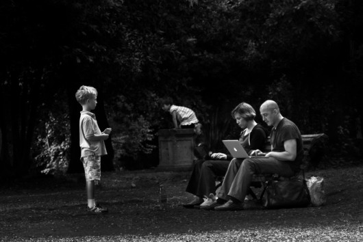 - First of all: Thank you for seing my photo :-) Then: The picture is ( I´m sad to say) NOT staged! I never stage my photoes. It was taken in Villa Borghese in Rome. I sat beside and saw this "scene" for over half an hour, before I took the picture. The parents were preoccupied with their own life and computers. The kids tried to get the parents' attention all the time. Eventually the little girl gave up and started playing for herself, while the boy kept trying to get the adults' attention. For me it is a very sad picture and I was very unsure if I should publish it, but I agreed with myself, that the story was too strong, so that it was worth showing. The camera was an old Canon 40D. About me: Please visit my website.