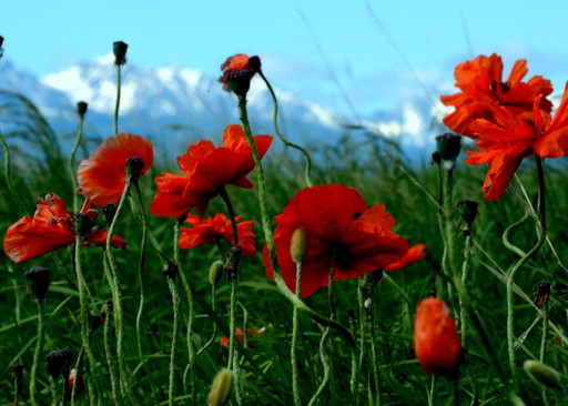 - This is such a positive image. Vivid green and red complimenting each other and the blue mountains and sky in the distance. Poppy flowers have such delicate petals which are wide and bend in interesting ways. The view from which this situation was shot makes it intimate.
