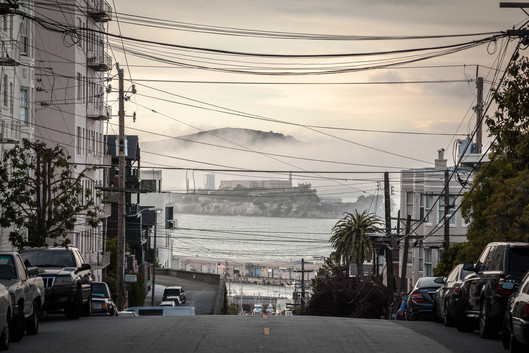 - Going through the selections, we kept an eye out for uniquely narrated images. The iconic solitary island of Alcatraz framed through the cluttered, but well placed, electrical wires depicts San Francisco grittier components. The fog blanketing “The Rock†is a sheer signature of the city normally portrayed within a closer proximity. This places the observer into a time warp in which they are directly looking at a prison that once housed the most notorious of criminals.