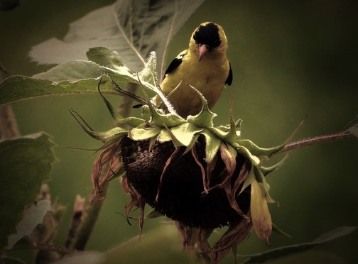 - A yellow bird on top of a sun flower, which appears more dead than alive. Something raw and real about this image, and definitely not not posed nor pretentious. Nice composition and showing how one needs the other. The bird eats the seeds and the seeds will grow new sun flowers.