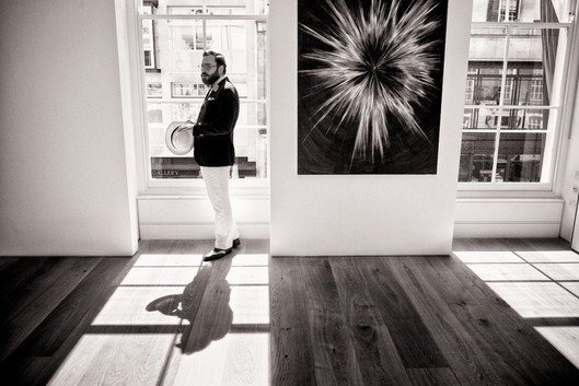 - This could be the artist or just a fashionable guest at a gallery. The composition tell a story of a man, a piece of art and a city outside in one photo, elegantly framed with light and shadow. Well done!