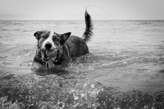 - what a wonderful capture ... the spray of the water, the skew of the ball, and the direct eye contact all demonstrate for us the pure ecstasy of dog + water + ball. i have to wonder what this image would look like in color. ~ illona
