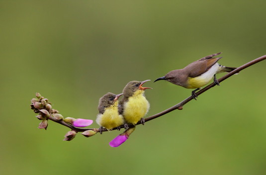 - A graceful composition with the curvature of the birds' bills being reflected by the sweep of the branch.