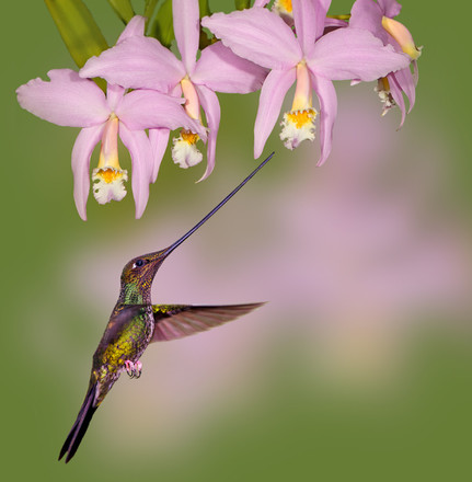 - This Sword-billed Hummingbird is beautifully positioned against the floral backdrop to give an elegant, colorful image.