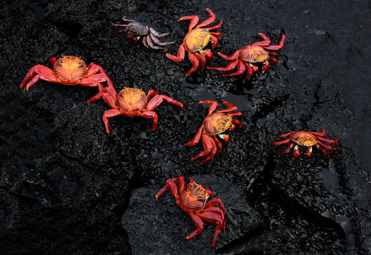 - Thanks for the Mark of Excellence. No, I didn't put the crabs here, they're in their natural setting. This photo was taken at the Galapagos Islands on Santa Cruz. This volcanic rock can be found all over and surrounding the islands, as well as the red lava crabs themselves. This was shot with the original Canon 5D and a 24-105 f/4L lens.