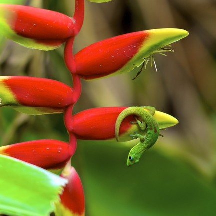 - Aloha! I was in Foster Botanical Garden in Honolulu, focusing in on the heliconia, when suddenly it moved. I rubbed my eyes. Looked again. Sure enough, there he was, hanging like a little trapeze artist, showing off. I used my Canon t4i with a 100mm macro lens to immortalize my little gecko friend. Mahalo for the recognition. What an honor!