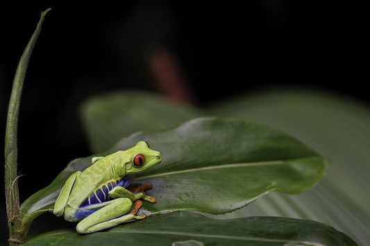 - The green leaves along with the red and black background really show off this red eyed tree frog's amazing colours. You have given him plenty space allowing for an airy composition, nice space to the right for frog to gaze into, strong lines and saturated rainforest colours... The short depth of field gives the subject really sharp focus bringing him all the attention he deserves. Lovely photograph, well done and worthy winner of this round !