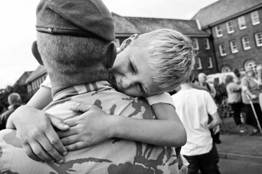 - Thank-you for appreciating my photograph. My name is Stuart Boulton, I live in the North East of England. The picture is of a Scots Guard soldier greeting his young son on returning to his base at Catterick Garrison in North Yorkshire, England, after a tour of Afghanistan. I used a Canon Eos 1D mkII camera with a 28mm lens, 1/1000 at f5.6, I removed colour and added contrast in the post processing.