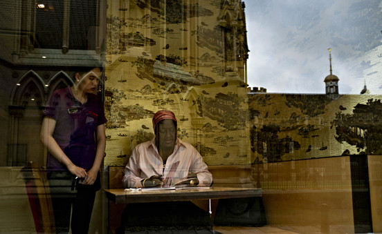 - This photo makes you look once, twice, then a third time. Many layers with the big clock, the man, the room, the city in the background, the sky. Well done composition and storytelling.