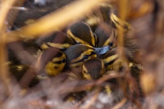 - Seeing the ducklings revealed through the foreground vegetation lends a sense of discovery. Their tightly huddled heads are a heartwarming sight.