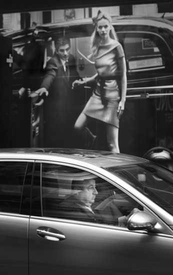 - Well, thank you. I'm glad you like my picture. It's taken on Bond Street, during a traffic jam. Bond Street is the finest and most expensive retail locations in London, therefore being stationary is a bore for the wealthy. This man is rich