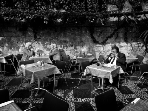 - My name is Albert Engeln, I am French and live since 15 years in south of Spain ( Almeria). This photo was taken in Barcelona, I was walking around the market place taking pictures, then I saw these scene at a restaurant nearby. The 2 woman, the man with his phone, the chairs, the background, everything seems just perfect, and made that picture with my Ricoh GRD. Thank you very much, Albert Engeln