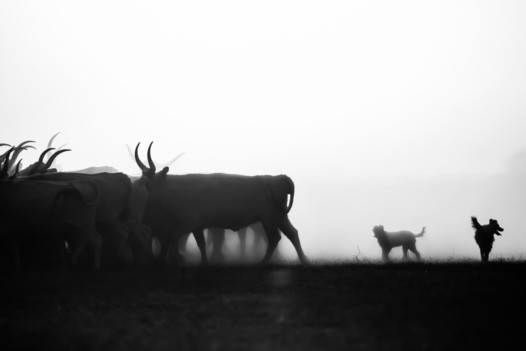 - the conversion of this image into black-and-white accentuates the receding landscape disappearing into the dust. a stunning and memorable image that speaks to the strength of the working dog. nicely done. ~ illona