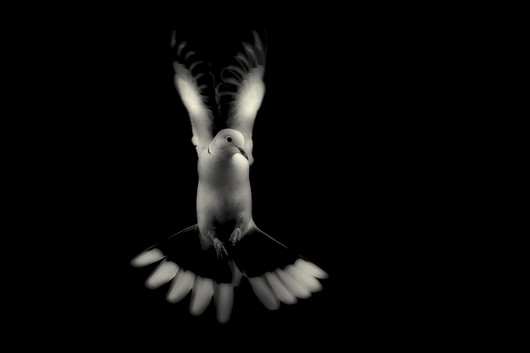 - The ghostly form of this flying dove works very well in monochrome, epecially since the head is tack-sharp.
