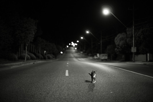 - The mood and framing of this image make it immediately captivating; the cat - in spite of being small in the foreground - stands out in this stark landscape, with the receding lines of the street and the lights and the long shadow of the cat adding to the strength of this image. Nicely done. ~ illona