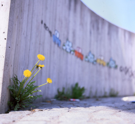 - We like the contrast of the big grey wall which comes loaded with history and meaning - and then there is new life. The yellow flowers could symbolise hope and a possible new beginning.