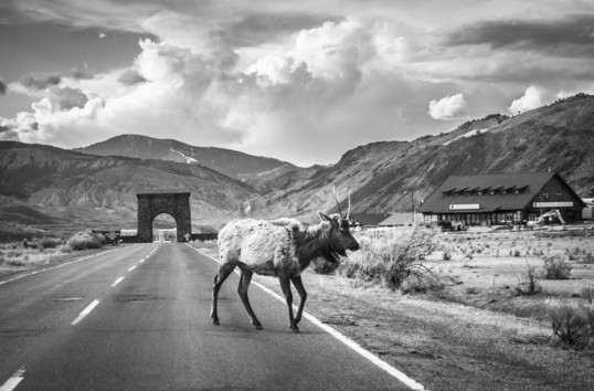 - Thank you for voting for my photo. Michael Orestes, North entrance gate of Yellowstone National Park (Gardiner, MT), shot with an Olympus OM-D EM-1, 12-40mm f2.8 lens, post processing light room. I was driving back into the Gardiner from the park when a large Elk decided to cross the road and stand there blocking my car. I decided this was a good opportunity to take some pictures. Glad I did!