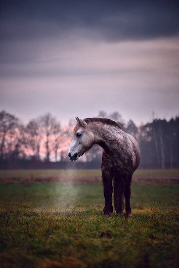 - this is an absolutely fabulous image ... the deep, pre-dawn or sunset shadows, the warm tones, the chill in the air seen in the horse's breath, and the brooding sky ... all work together to make an instantly captivating and intimate image. nicely done! ~ illona
