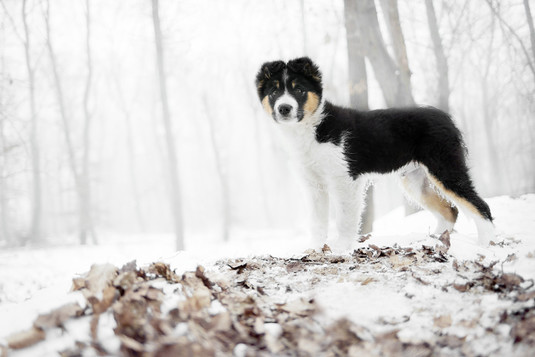 - what an absolutely dream and wonderful image. the starkness of the landscape allows this alert puppy to truly stand out in the snowy forest. minimal color draws the viewer's eye directly to the pup and gradually moving out to see the details like the frosted hair, the leaves, and then the ghost-like trees in the background. wonderful low angle as well. nicely done. ~ illona