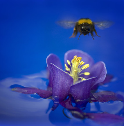 - We are loving the colour scheme, which is happening in this image. All those rich blue and purple tones, and then being complimented with a bit of yellow and a bumble bee buzzing from above, getting ready to land. Well spotted!