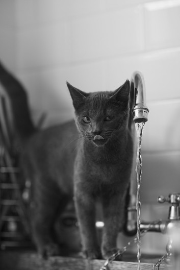 - this image is immediately engaging because of the kitten's direct stare and its fun expression. the choice to convert to black-and-white allows the trickle of water to stand out, as well as the shine on the chrome and the catchlight in the kitten's eyes. nicely done. ~ illona