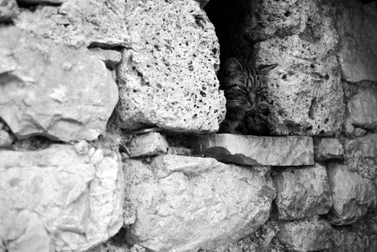 - the strength in this image is the simplicity of elements, yet the variety and richness of texture. while our eye is definitely drawn to the cat resting in the opening in the rocks, our attention is then allowed to travel throughout the frame to take in the different textures and crevices. beautifully seen and handled in post. ~ illona