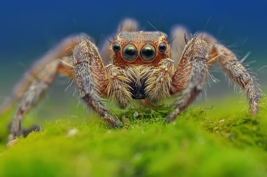 - Beautiful portrait of the jumping spider, it is a difficult subject to photograph because of its small size, and there you are very well happen. The development is perfect on the eyes, the depth of field is well managed. sharpness is superb, the background is really beautiful and brings out beautiful subject. A beautiful work.
