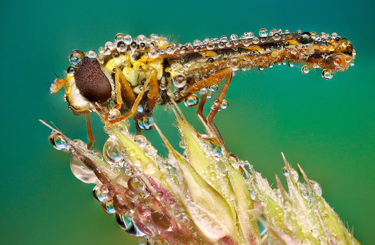 - First, let me say that this contest was very hard for me to judge, there was a lot of beautiful things! Then I judge the quality of the photo, and technical difficulty. This picture is just wonderful, I know how difficult to make such an image. Congratulations Wonderful photo of this fly, everything is very good in this image, the framing is impeccable, the subject is very well developed through the dew. The development is perfect, sharpness is superb and the background with the green gradient is just superb. Very very good job.
