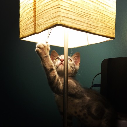 - What an absolutely fun image. The framing of the eyes on either side of the lamp's post is perfect, and the kitten's intensity draws us in. I would suggest cloning out the wires coming from the speaker(?) so as to simplify the image and eliminate that distraction. But a super fun image. ~ illona