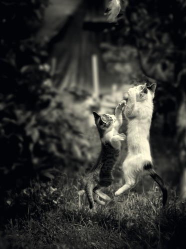 - What an amazing capture! The depth of shadows and the great highlights allow for these kittens to truly stand out (or rather jump out!) of their landscape. The action captured here is truly fabulous, and the choice to convert to black-and-white allows the subjects to stand out more. I would suggest just a little bit of photoshop work to clone out some of the distracting background like the rod in the distance and whatever is behind the tabby/white cat in the grass, so that the two kittens really pop out of their setting. But wonderfully captured and a great photo! ~ illona