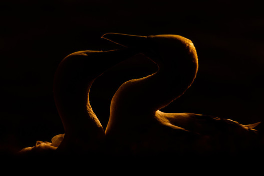 - Only half a dozen 'brush strokes' of golden rim lighting allow the form of these gannets to be picked out from the black canvas. A bold and effective composition.